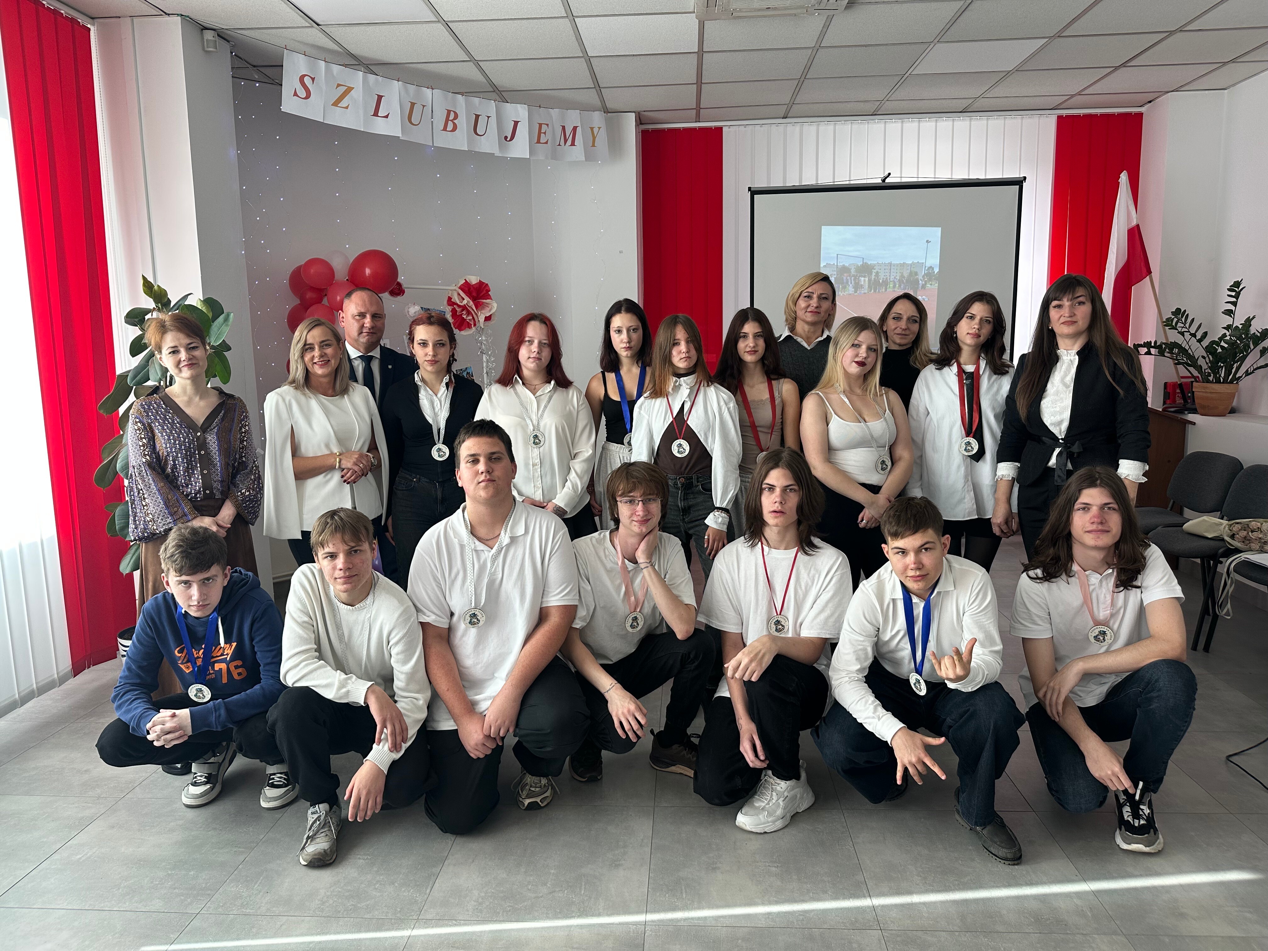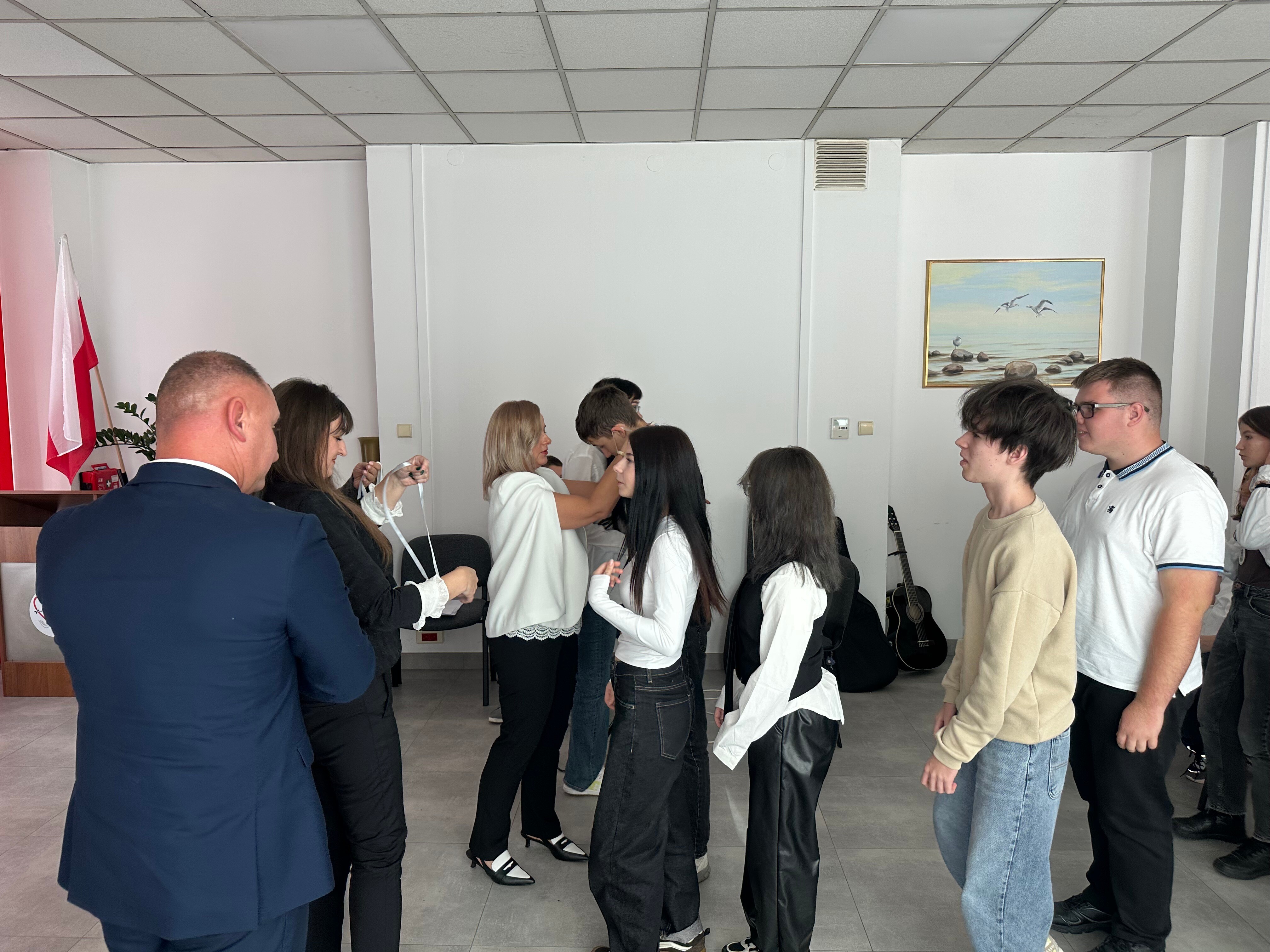 Po części oficjalnej nastąpiła część artystyczna przygotowana przez uczniów klas pierwszych. Uczniowie klasy 1B zaprezentowali swoje talenty w występie muzyczno-tanecznym – wykonali utwory na gitarze oraz przygotowali układ taneczny, który spotkał się z entuzjastycznym przyjęciem publiczności. Z kolei uczniowie klasy 1A zaprezentowali nastrojową recytację wiersza, wprowadzając wszystkich w refleksyjny i uroczysty nastrój. Na zakończenie uroczystości odbyło się symboliczne pasowanie na uczniów, podczas którego pierwszoklasiści otrzymali pamiątkowe znaczki. Ten gest był wyrazem pełnego przyjęcia ich do społeczności szkolnej i przypieczętowaniem początku nowego etapu w ich życiu edukacyjnym.