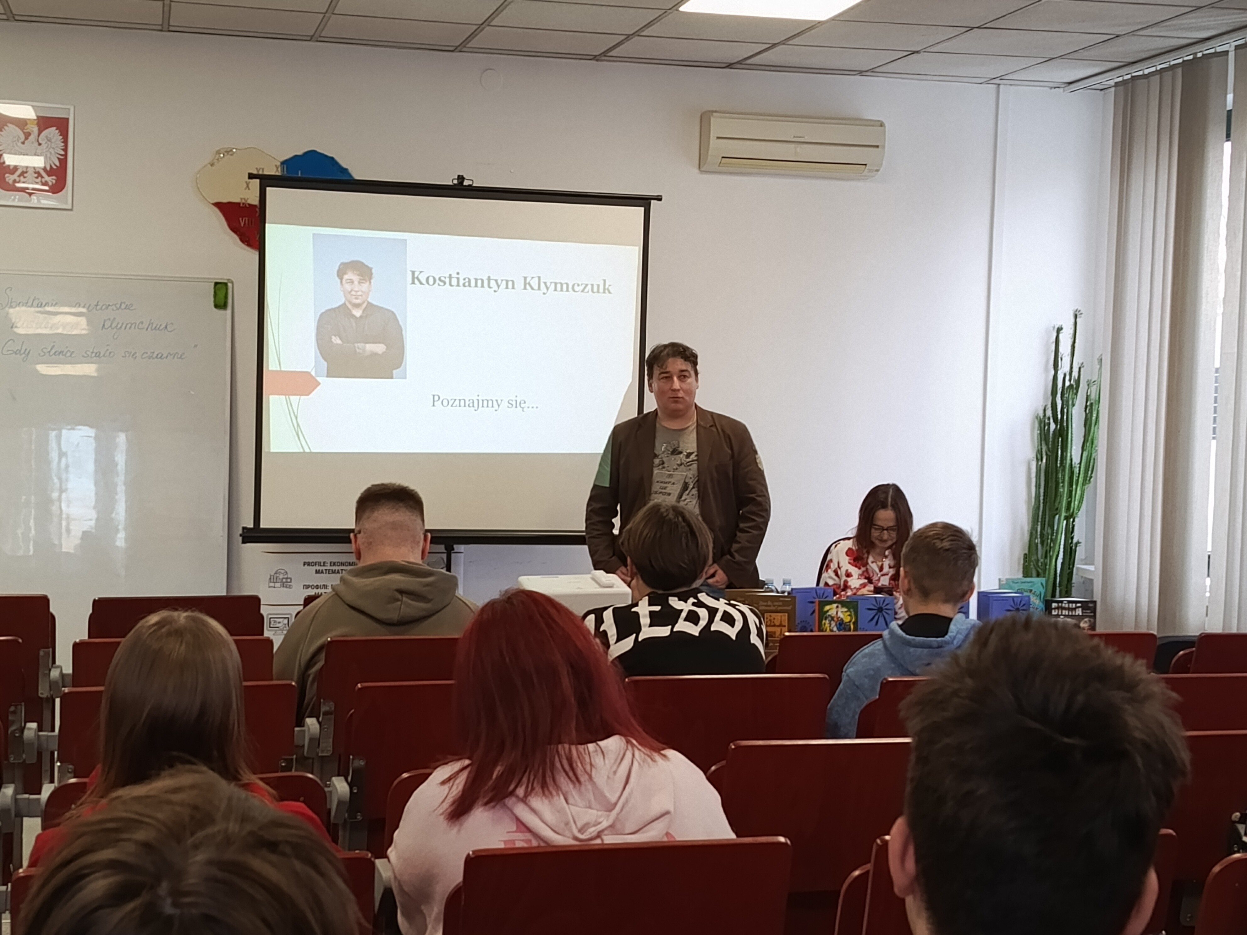 Do Liceum Hereditas zawitał wyjątkowy gość – Kostiantyn Klymchuk, dyrektor ukraińskiego wydawnictwa Czas Zmian Inform, pisarz i autor pięciu książek, uczestnik prestiżowych rezydencji literackich w Sopocie i Przemyślu, laureat nagród literackich, starszy pracownik naukowy muzeum oraz frontowy wolontariusz. Jego biografia łączy świat literatury z realiami współczesnej Ukrainy, tworząc perspektywę, która porusza i inspiruje.